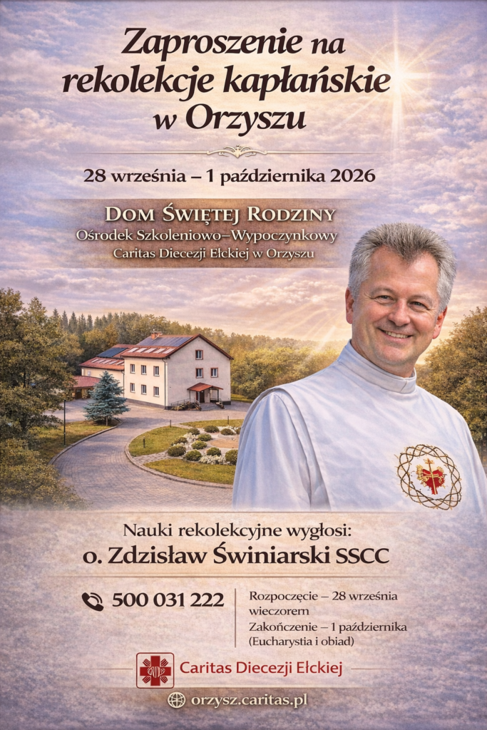 Serdecznie zapraszamy Księzy do udziału w rekolekcjach kapłańskich, które odbędą się w dniach 28 września – 1 października 2026 r. w Ośrodku Szkoleniowo–Wypoczynkowym Caritas Diecezji Ełckiej – DOM ŚWIĘTEJ RODZINY w Orzyszu. Czas rekolekcji będzie okazją do modlitwy, refleksji nad kapłańskim powołaniem oraz odnowienia duchowych sił w atmosferze ciszy i braterskiej wspólnoty. Nauki rekolekcyjne wygłosi o. Zdzisław Świniarski SSCC. Rekolekcje rozpoczną się 28 września wieczorem, a zakończą wspólną Eucharystią i obiadem 1 października. Niech ten czas stanie się dla nas wszystkich momentem duchowego umocnienia oraz pogłębienia relacji z Chrystusem i braćmi w kapłaństwie. Prosimy o potwierdzenie udziału:Sekretariat Caritas