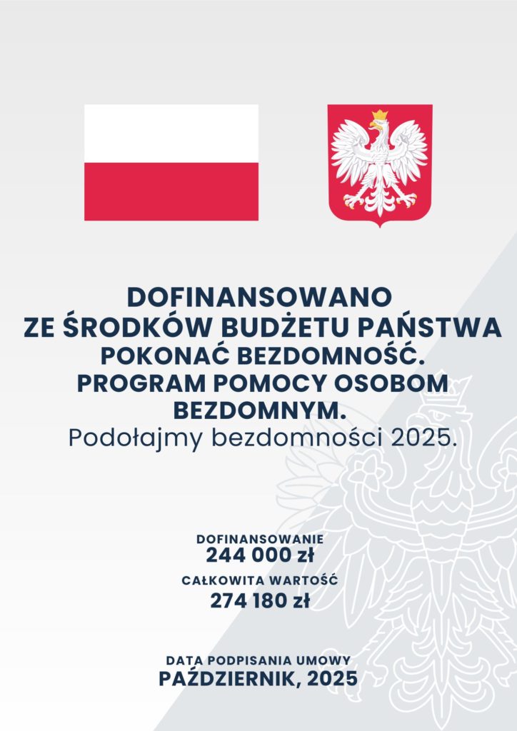 W październiku 2025 r. Caritas Diecezji Ełckiej podpisała umowę z Ministerstwem Rodziny, Pracy i Polityki Społecznej na realizację zadania publicznego pod tytułem: „Podołajmy bezdomności 2025” w ramach programu „Pokonać bezdomność. Program pomocy osobom bezdomnym” edycja 2025 r. Zakończenie realizacji projektu zaplanowano na 31.12.2025 r.