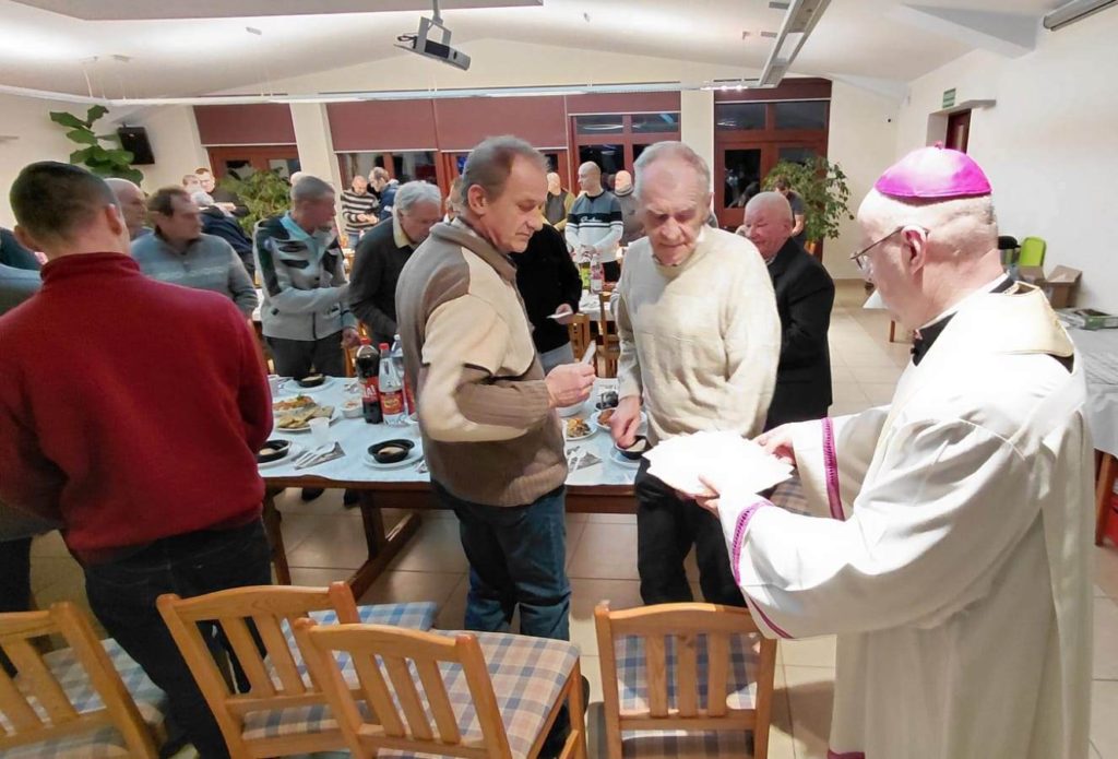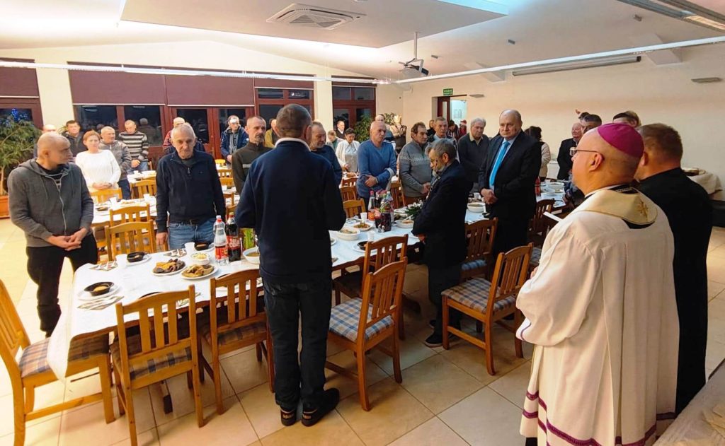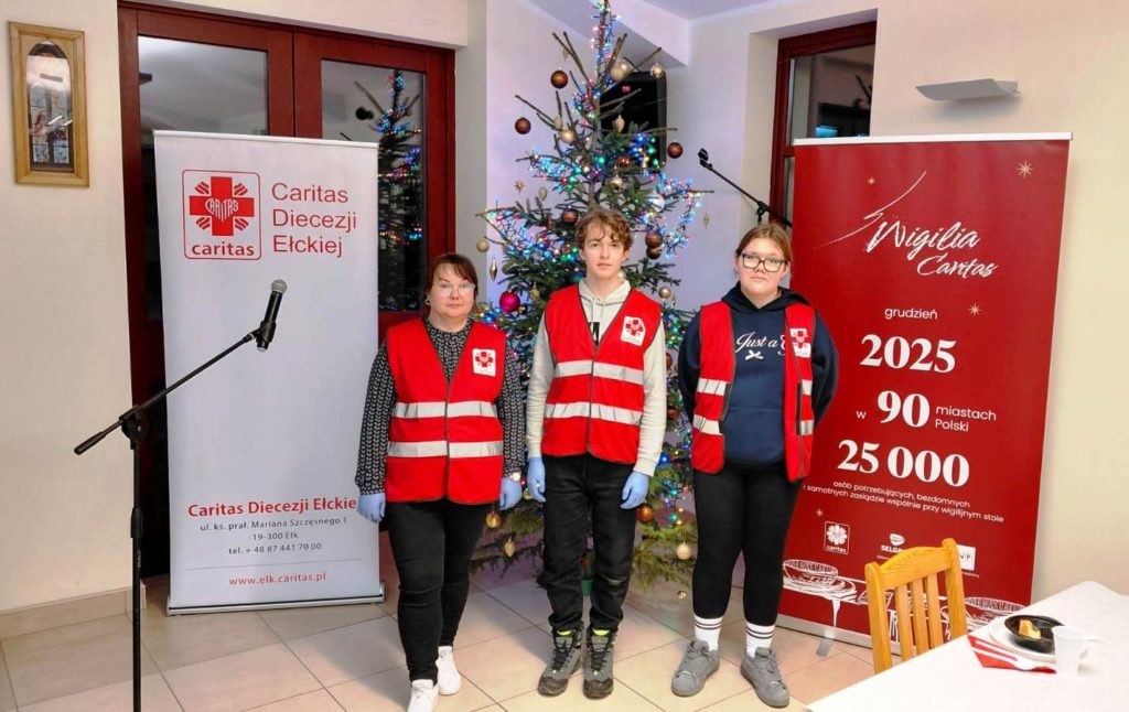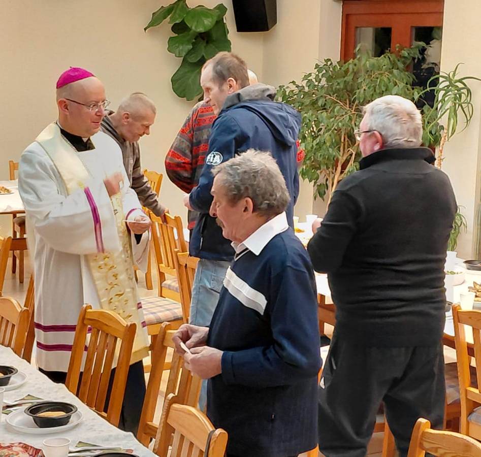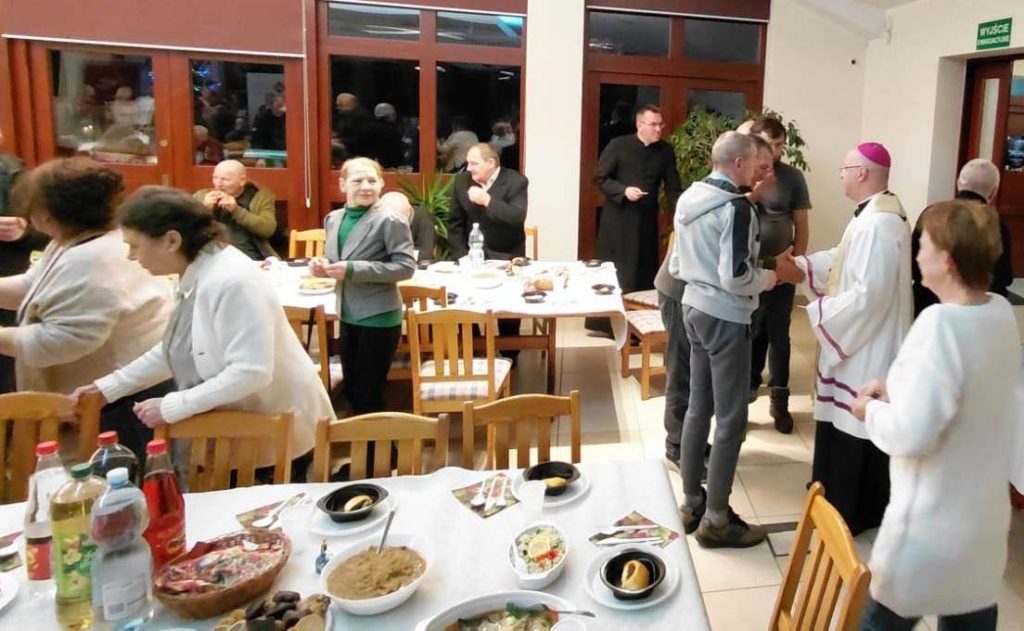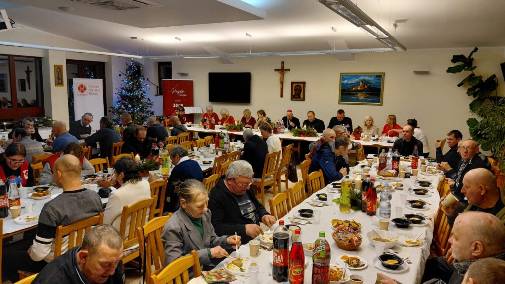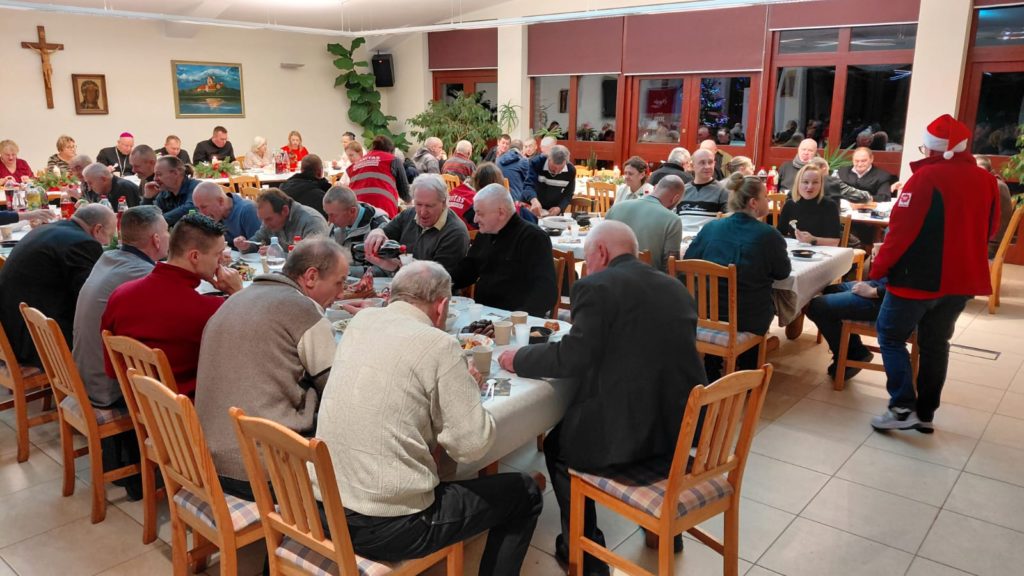 Wigilijny stół przygotowała kuchnia Caritas wraz z pracownikami oraz mieszkańcami Schroniska im. św. Ojca Pio w Ełku. Przy stołach zasiedli podopieczni schroniska, osoby w kryzysie bezdomności, a także osoby ubogie i potrzebujące. Był opłatek, wspólne życzenia oraz prawdziwie domowa, świąteczna atmosfera.