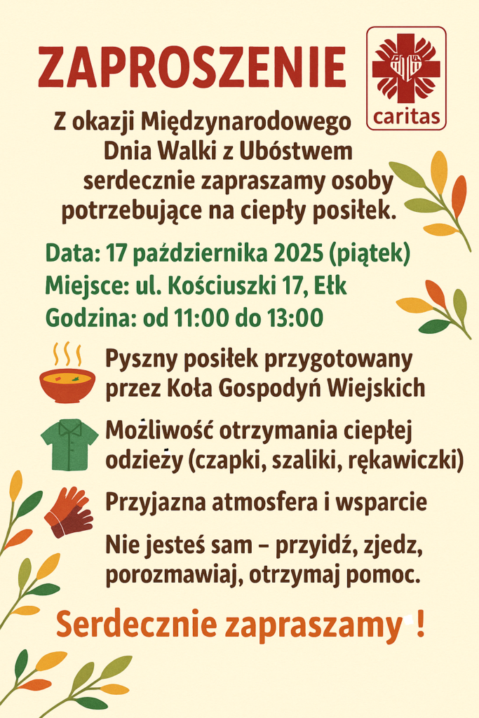 Z okazji Międzynarodowego Dnia Walki z Ubóstwem, obchodzonego 17 października, Caritas Diecezji Ełckiej zaprasza osoby potrzebujące na spotkanie w duchu solidarności i życzliwości.